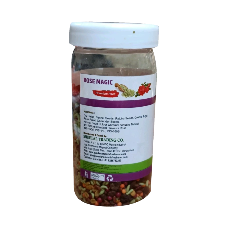 Indulge in the enchanting aroma and taste of Avedana Rose Magic Mukhwas, a delightful blend infused with the essence of fragrant rose petals. This mouth freshener combines sweet and refreshing ingredients like fennel seeds, sugar crystals, and dried rose petals to create a flavorful and aromatic after-meal treat. Known for its soothing properties and ability to refresh your breath, this mukhwas is perfect for adding a touch of sweetness and elegance to your palate, anytime, anywhere.