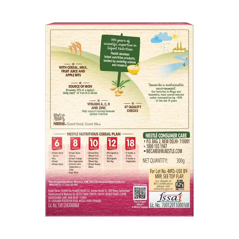 Nestlé CERELAC Multigrain & Fruits (for 12 to 24 months) is a baby cereal that combines the goodness of grains, milk, and fruits. It provides essential nutrients, including iron, which supports your baby’s growth. Each serving offers 16 important nutrients, such as vitamins and minerals, and fulfills 59% of a baby’s daily protein requirements. It is designed to support healthy development and is suitable for babies transitioning to more complex foods. To prepare, mix the appropriate amount of water with the cereal powder, stir until smooth, and feed immediately.