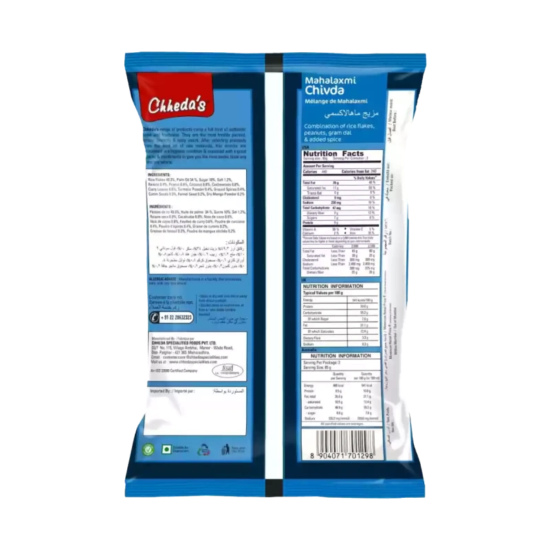 Chheda’s Mahalaxmi Chivda is a delightful, crispy snack mix that combines the perfect balance of flavors and textures. This traditional Indian snack is made from premium-quality flattened rice (poha), roasted to a golden crisp and blended with a variety of spices, crunchy peanuts, fried lentils, and aromatic curry leaves.