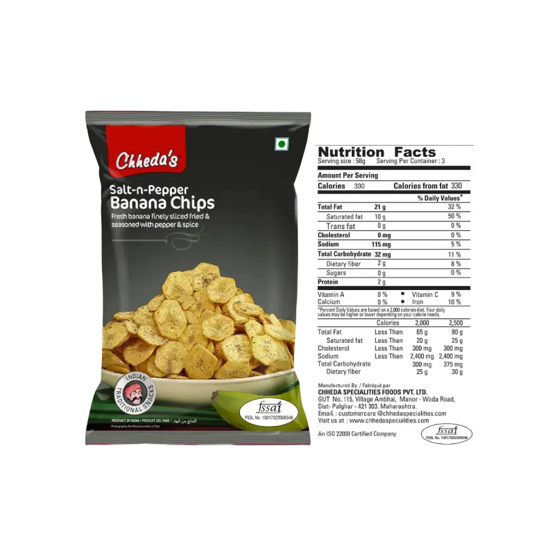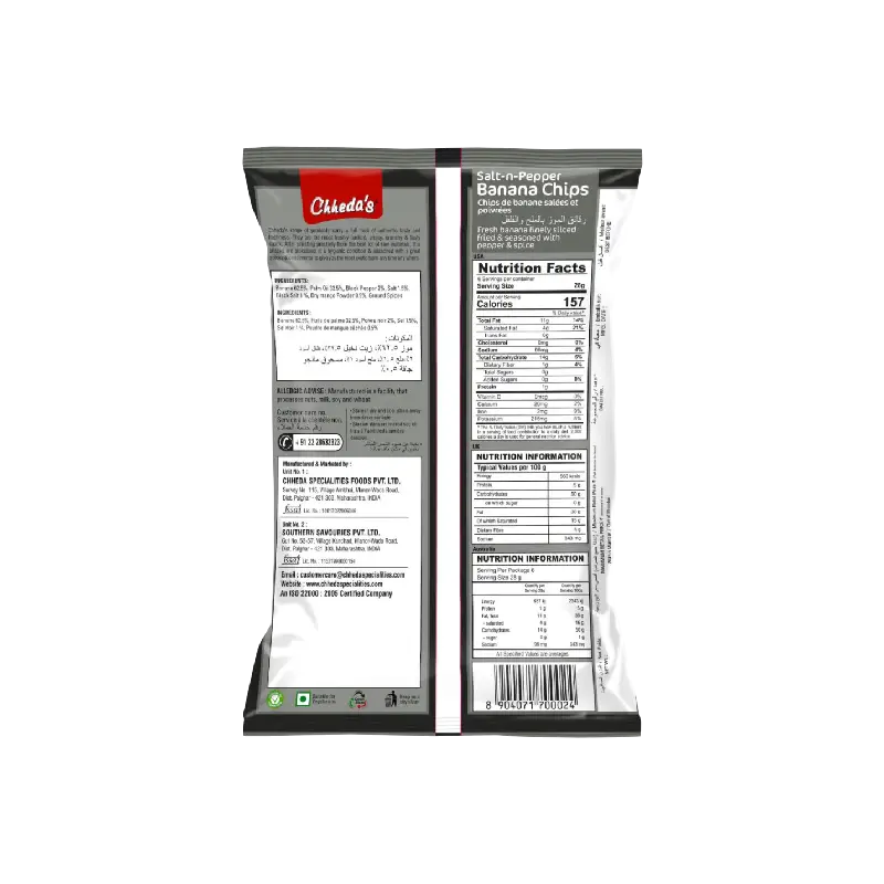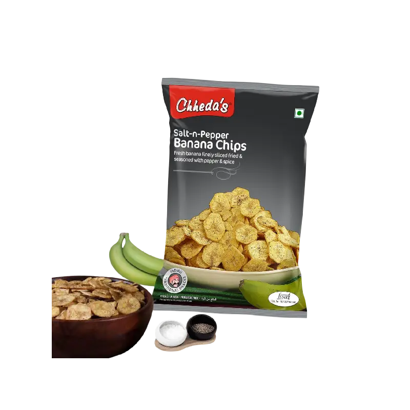 Enjoy the irresistible crunch of Chhedaโ€™s Salt and Pepper Banana Chips, a delightful snack that combines the natural sweetness of bananas with a savory twist. These chips are made from high-quality bananas, thinly sliced and fried to golden perfection, then seasoned with just the right amount of salt and a hint of pepper to elevate their flavor. The result is a uniquely delicious snack that is both satisfying and nutritious, making it perfect for munching at any time of the day. Whether youโ€™re enjoying them with a cup of tea or as a quick on-the-go snack, Chhedaโ€™s Salt and Pepper Banana Chips are sure to please your taste buds!
