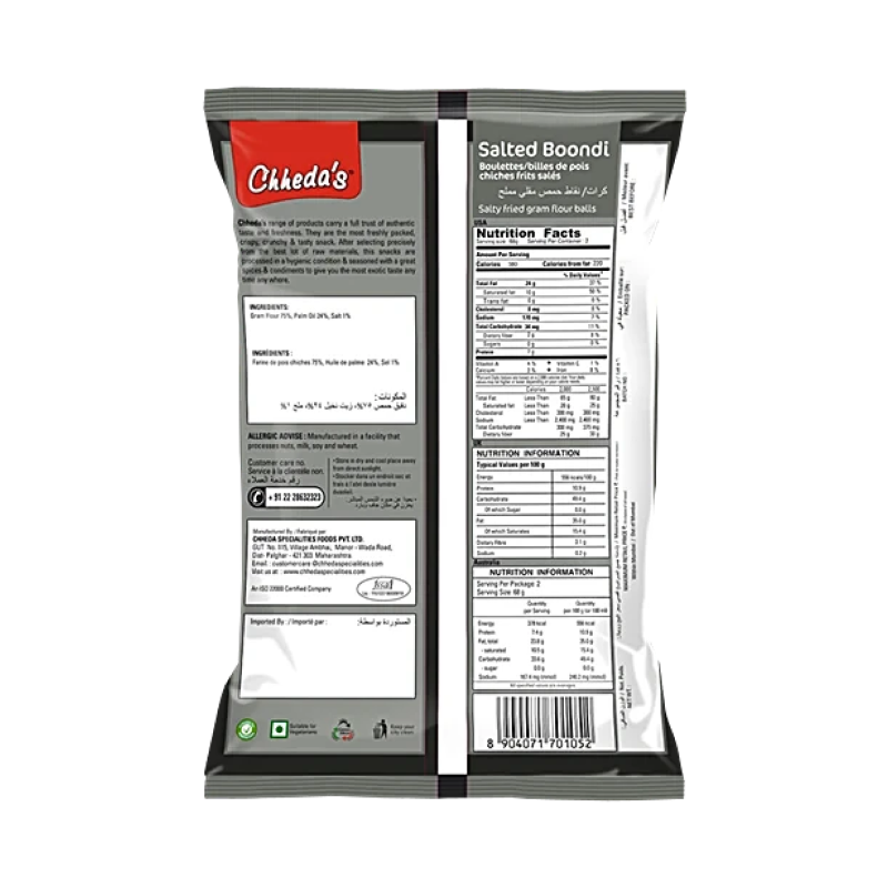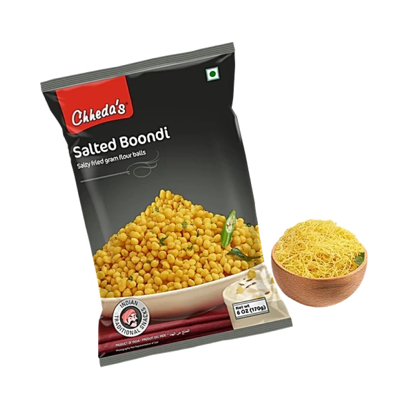 Experience the classic taste of Chheda’s Salted Boondi, a crunchy and savory snack made from golden, deep-fried gram flour droplets. Lightly salted for the perfect balance of flavor, this versatile snack can be enjoyed straight from the pack or used to add a delightful crunch to your favorite dishes. Whether you mix it into raita, sprinkle it over salads, or use it as a base for traditional Indian chaats, Chheda’s Salted Boondi offers a burst of texture and taste with every bite.