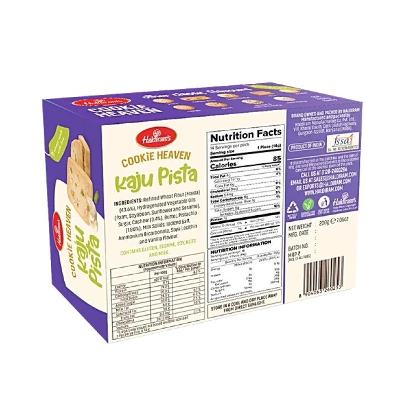Indulge in the rich, nutty goodness of Haldiram Cookie Heaven Kaju Pista, a premium cookie that combines the crunch of cashews (kaju) and pistachios (pista) with a buttery, melt-in-your-mouth texture. These cookies are made with the finest ingredients and packed with real nuts, offering a luxurious and flavorful snack perfect for any occasion. Whether enjoyed with tea or on their own, these cookies are a treat for nut lovers.