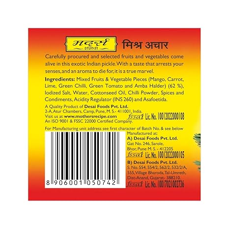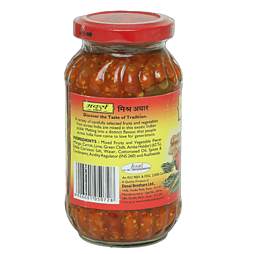 Mother’s Recipe Mixed Pickle is a spicy and delicious side dish that will turn your mundane meals into a tasty and lip-smacking treat. This delightful accompaniment is prepared using the right mix of spices and vegetables. You can enjoy this flavourful pickle with all kinds of recipes. It can also be had with snacks and fries. So, wait no more. Buy Mother’s Recipe Mixed Pickle online today!