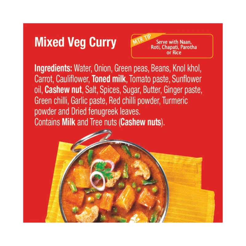 MTR Ready To Eat Mixed Vegetable Curry is a rich, hearty, and flavorful curry that brings together a variety of fresh vegetables, all cooked in a mildly spiced, aromatic gravy. Packed with the goodness of seasonal vegetables like peas, carrots, beans, and potatoes, this curry is a perfect combination of taste and nutrition. Itβs the ideal solution for a busy day when you need a wholesome meal thatβs ready to serve in just minutes.