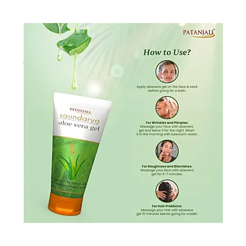 Patanjali Aloe Vera Gel rejuvenates, nourishes, and beautifies the skin. It can also be used as an anti-tan pack, effectively reducing dryness and roughness. This versatile gel addresses dandruff and hair fall, making it an excellent all-in-one solution. Regular use helps reduce dark spots and enhances skin glow, leaving your skin radiant and healthy. Perfect for achieving a natural, flawless complexion.