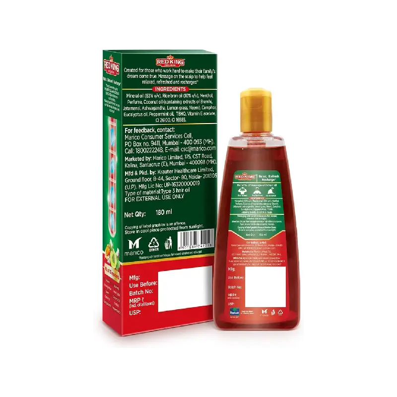 Revitalize your hair care routine with Red King Cooling Hair Oil, specially formulated to soothe your scalp while promoting healthy hair growth. Infused with natural ingredients, this cooling oil provides a refreshing sensation that helps relieve itchiness and irritation, making it perfect for hot and humid conditions. The lightweight formula absorbs quickly, delivering essential nutrients to strengthen your hair from root to tip. Ideal for all hair types, Red King Cooling Hair Oil can be used as a relaxing massage oil or as a pre-wash treatment to leave your hair feeling soft, shiny, and manageable.