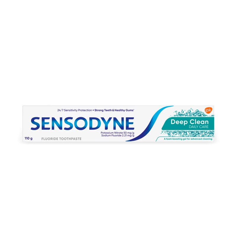 When the protective layer of teeth (enamel) is worn away or gums recede, the dentine underneath becomes exposed. When the exposed dentine comes in contact with hot, cold, sweet or sour food and drinks, it can trigger a sharp short sensation called tooth sensitivity. Sensodyne Deep Clean is a daily fluoride toothpaste that helps protect against tooth sensitivity, while still providing the benefits of a regular paste like strong teeth and health gums. This toothpaste is powered with foam boost technology and brushing with this toothpaste not only leaves you with a lasting cooling sensation, but also gives your teeth the deep clean they deserve. With twice daily brushing, you can enjoy your favorite foods and drinks without the worry of sensitive teeth. Sensodyne Deep Clean tooth paste is available in a 70 gm pack. Always follow instructions and guidance included on the pack before use.