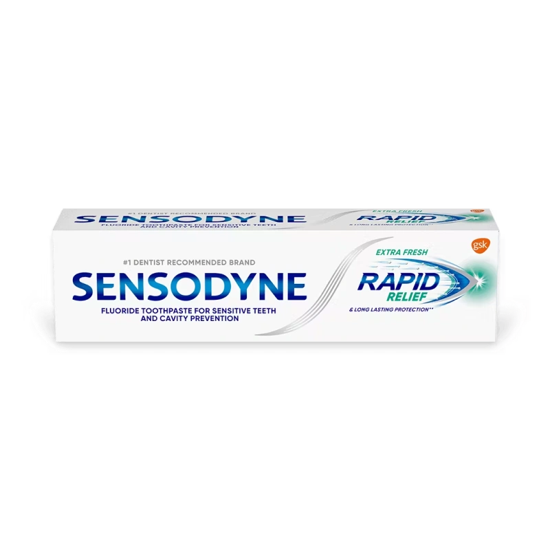When the protective layer of teeth (enamel) is worn away or gums recede, the dentine underneath becomes exposed. When the exposed dentine comes in contact with hot, cold, sweet, or sour food and drinks, it can trigger a sharp, short sensation called tooth sensitivity. Sensodyne Rapid Relief is a daily fluoride toothpaste that acts rapidly against tooth sensitivity while still providing the benefits of a regular paste, such as strong teeth and healthy gums. It starts to act rapidly by building a mineral-like layer over exposed dentine and within microscopic channels. The paste also builds ongoing protection with every brush, so that you can enjoy your favourite foods and drinks without the worry of sensitive teeth.